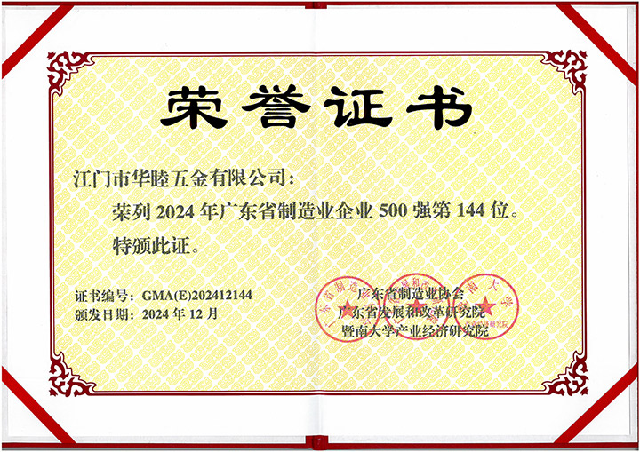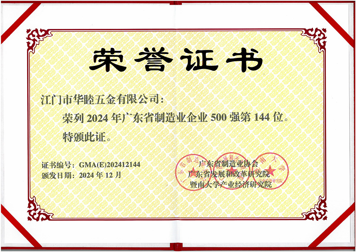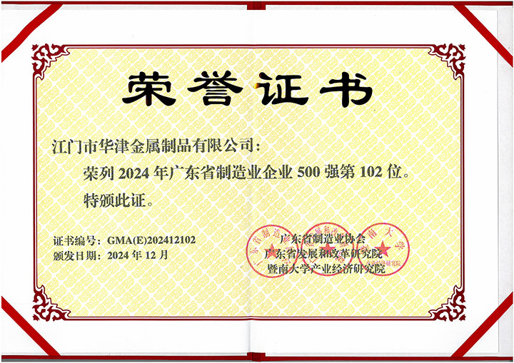 集團(tuán)創(chuàng)建以來,社會各界對華津的企業(yè)發(fā)展給予了充分的肯定和高度的評價。華津榮列2024年廣東省制造業(yè)企業(yè)500強(qiáng)第102位,華睦榮列2024年廣東省制造業(yè)企業(yè)500強(qiáng)第144位,并且先后榮獲:國家高新技術(shù)企業(yè)、廣東省工程技術(shù)研究中心、廣東省名牌產(chǎn)品、江門市工程技術(shù)研究中心、標(biāo)準(zhǔn)化工作AAA級企業(yè)、江門企業(yè)百強(qiáng)等稱號。